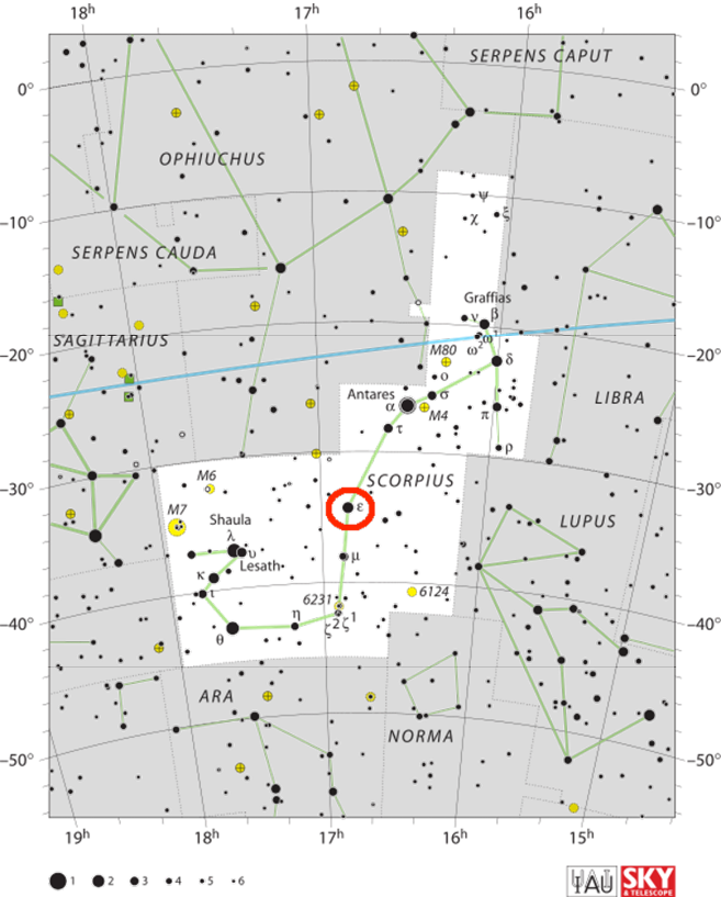 Epsilon Scorpii is an orange giant star, lying 63.7 light years away.