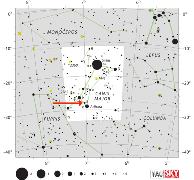 Delta Canis Majoris is an orange-red supergiant that lies 1,120 light years away.