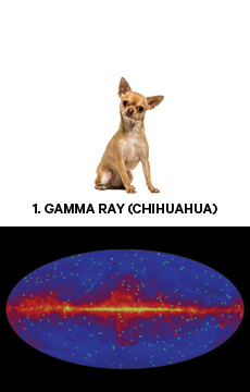 It’s important to paws (couldn’t help myself) here, and appreciate that this is not to scale. The Chihuahua photon has 300 billion times more energy than visible light’s border collie. That is a lot of tiny leg movements! But this is an analogy, remember. It may have gone to the dogs. But it’s much cuter than Schrödinger’s Cat; this is Photon’s Hounds. And, unlike that poor old cat, they get to live 100% of the time.