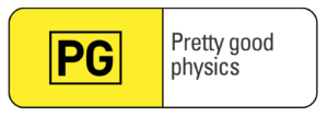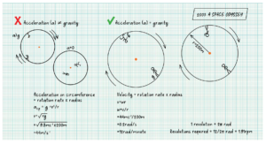 That’s a very high speed. Indeed, what about the rotation rate of the wheel? It’s velocity/radius. Plug in the numbers again, and you find that it’s two rotations per minute! Just two full turns every minute to give the astronauts inside a feeling of gravity. This gets a G for Good physics.