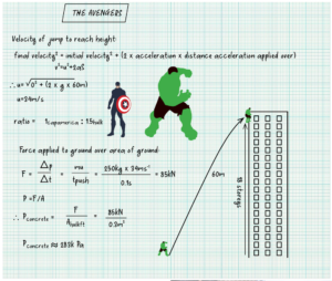 In more familiar units, this is 120 km/h, an incredible speed that’s surely going to do some damage to the footpath. The force of the jump isn’t just his speed, but rather how quickly he pushed off the ground to achieve that speed – technically, momentum. Force is the change in momentum (from a standing start of zero to the Hulk’s mass x 34 m/s), divided by the time it occurred over. It’s a little harder to be precise here, so with any good science calculation we need to start making some estimations.
