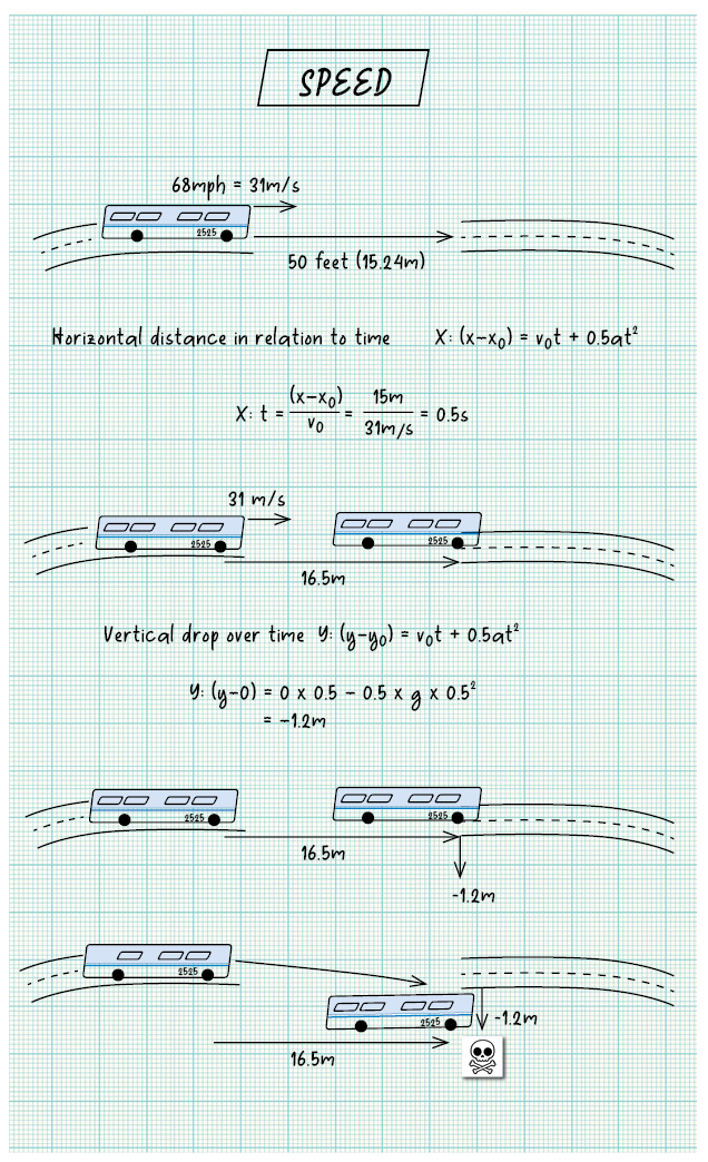 Well, using kinematics (the study of motion) we can consider the two components of this bus independently – its travel horizontally (which we use to work out the time it would take to traverse the gap) and that in the vertical direction. Since its motion is entirely horizontal, it has no vertical speed – it’s not going up or down, at least not until it leaves the road and begins to fall under the acceleration of gravity. A formula my first year Physics 101 students are very familiar with is: distance = speed x time taken to travel + ½ acceleration x time2, or: s = µt + (1/2)at2