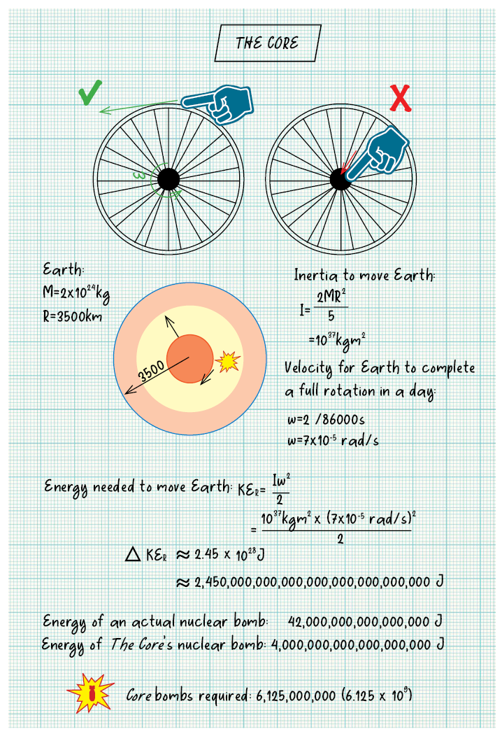 The nuclear energy calculation is, by the way, also awful. The number of nukes required to spin something the size of Earth itself is beyond imagining, but would be billions of times more than what’s provided – even assuming that energy was somehow used in its entirety to turn, not push.