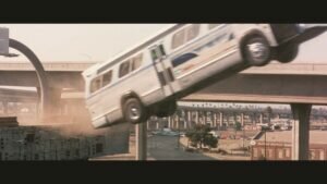 Plug in the numbers: the bus has fallen by 1.2 m over the course of traversing the gap. In other words, the bus will not safely land on the far side of the bridge. In fact, it would be almost perfectly decapitated by the bottom of the opposite road – doing as much damage, I suspect, as the bomb itself placed on that bus. But in the film it manages to sail over that gap. And by the way, there’s no CGI involved in the stunt, and the bus actually does this launch on film. They don’t defy physics – they use a hidden ramp.