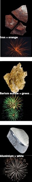 Burning pieces of solid metal also contribute to the colour effects seen in fireworks, sparklers, and lance-works (“firework” words and shapes, usually on a ground-based frame). The hot burning pieces of metal are ejected while reacting with oxidants, and with oxygen in the air. Metals used include aluminium (Al), magnesium (Mg) and titanium (Ti), which burn with intense white light, while iron (Fe) gives the sparks an orange colour.