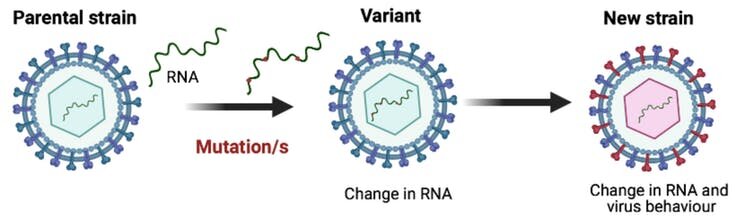 Errors often occur during the process of duplicating the viral RNA. This results in viruses that are similar but not exact copies of the original virus. These errors in the viral RNA are called mutations, and viruses with these mutations are called variants. Variants could differ by a single or many mutations.