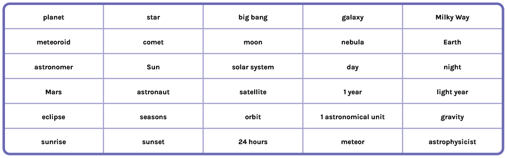 Bingo: Give students a 3×3 grid and ask them to write a key space-term from the table above in each of the cells.