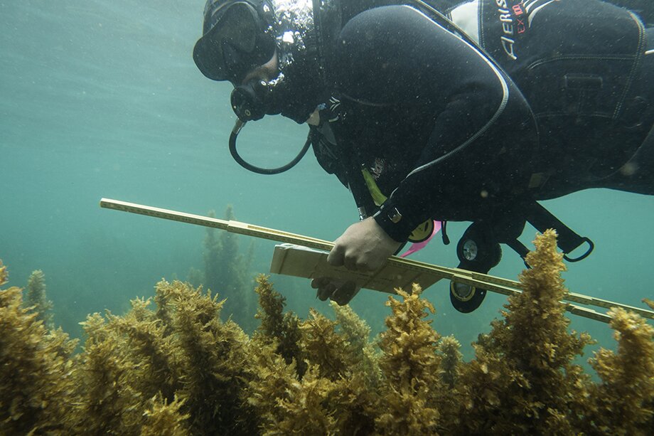 So it seems incongruous to see a diver spooling out a measuring tape, looping it around coral and clams, or a wet-suited figure snorkelling through seaweed with a clipboard in hand. This is how you’ll find the ANU researchers, should you pass by on your glass-bottomed boat. They’re not on holiday, expecting to be impressed, but at work, with jobs to do. And that’s how they see the ecosystem around them too: a seascape at work, functioning thanks to the well-oiled interaction of its components.