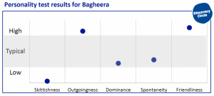 Below is an example of one cat’s Feline Five results. On the graph, the area shaded in grey is the ‘typical’ zone. Points above the typical zone are high, and points below the typical zone are low. Bagheera is clearly a friendly cat, which is important because he regularly attends an Adelaide school with his owner, a teacher, and is popular with the students (you can read more about Bagheera in this Adelaide Now article).