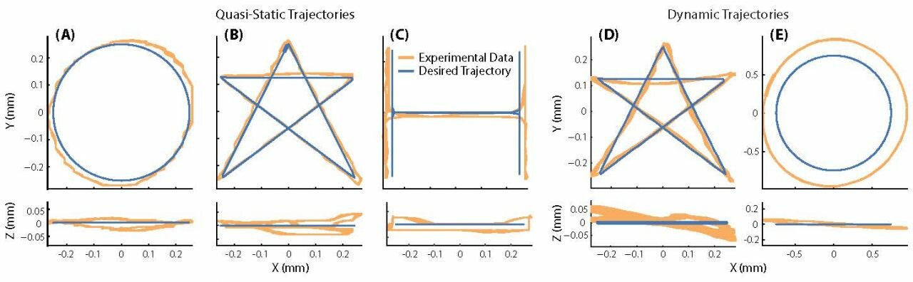 “Delta robots are pretty fast but ours sort of blows them out of the water with how fast it is. Most currently available Delta robots are around a couple of Hertz, while our Delta robot can move up to 75 Hertz – 15 to 25 times higher frequency than anything that’s currently available. So that opens up the areas it can be used for. It’s also much smaller than any robot that we’ve seen – just the linkages are about the size of a penny.”